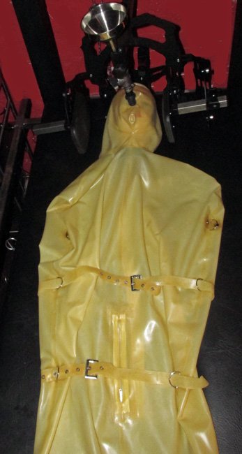 Heavy Rubbersuit in Übergröße mit Kapuze aus 1,2 mm dickem Gummi. Er wiegt ca. 8 kg und ist ein bisschen für die Ewigkeit. Die Welt bleibt draussen, wenn Du in ihm steckst ! Hundemaske aus Leder, Systemmaske aus Leder mit abnehmbarer Augenmaske und Mundknebel, bipolare Elektroplugs, die bombastisch sitzen, Eichelschlaufe mit 3 Stahlkugeln und bipolarer Sacksling. u.v.m.