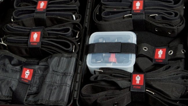 1 Paar Handhalterung. Die Handhalterungen sind von ca. 15 bis 30 cm Umfang einstellbar. Eine Oberschenkelhalterung, 1 Paar Fußhalterung und ein Verbindungsgurt für die Fußhalterungen.